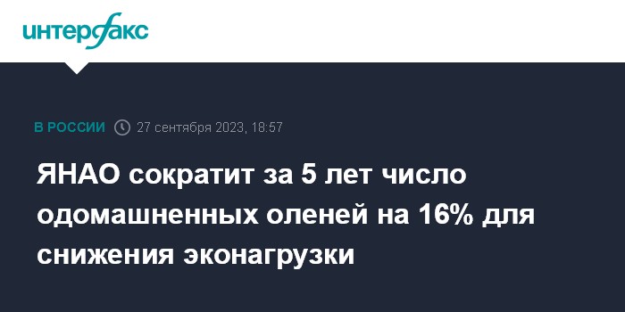 Москва. 27 сентября. INTERFAX.RU - Власти Ямало-Ненецкого автономного округа (ЯНАО) рассчитывают, что за 5 лет поголовье одомашненных северных оленей сократится в регионе с нынешних 620 тысяч голов до 520 тысяч голов, что поможет решить проблему перевыпаса этих животных.