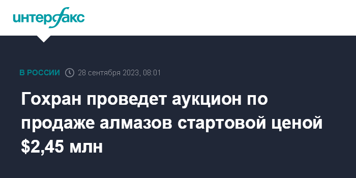 Москва. 28 сентября. INTERFAX.RU - Гохран 28 сентября проведет четвертый в 2023 году аукцион по продаже на внутреннем рынке алмазов (за исключением алмазов спецразмеров, то есть 10,8 карата и более), сообщило ведомство.