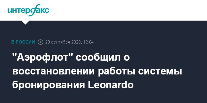 Москва. 28 сентября. INTERFAX.RU - Авиакомпания "Аэрофлот" сообщила о восстановлении работы российской системы бронирования Leonardo.