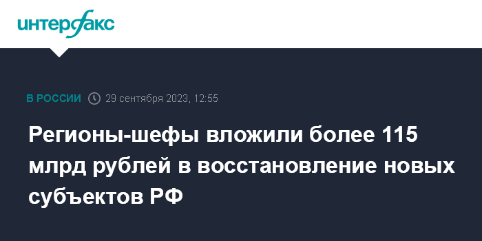 Москва. 29 сентября. INTERFAX.RU - Более 115 млрд рублей вложили в 2023 году регионы-шефы в восстановление новых субъектов федерации, заявил на заседании Общественного совета при Минстрое глава ведомства Ирек Файзуллин.
