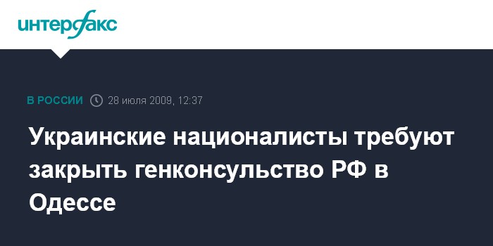Москва. 28 июля. INTERFAX.RU - Одесская областная организация организации националистического толка - всеукраинского объединения "Свобода" потребовала закрыть генеральное консульство России в Одессе.