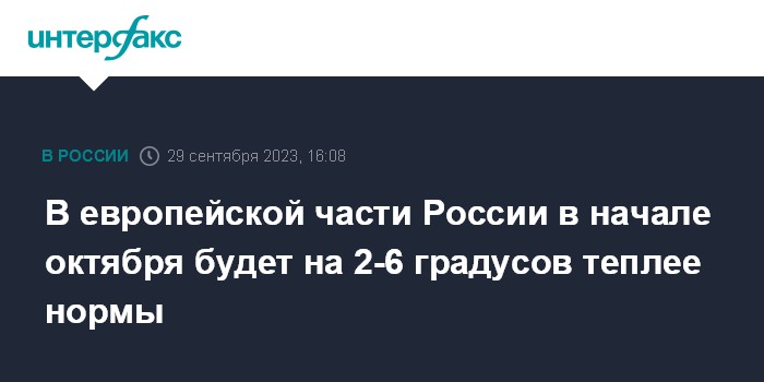 Москва. 29 сентября. INTERFAX.RU - Температура выше нормы на 2-6 градусов прогнозируется в начале октября на европейской территории России, сообщил "Интерфаксу" научный руководитель Гидрометцентра России Роман Вильфанд.
