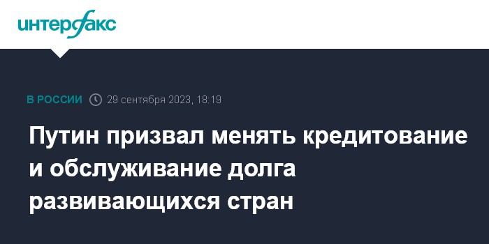 Москва. 29 сентября. INTERFAX.RU - Президент РФ Владимир Путин заявил о необходимости менять международные правила в сфере кредитования и обслуживания долга развивающихся стран.