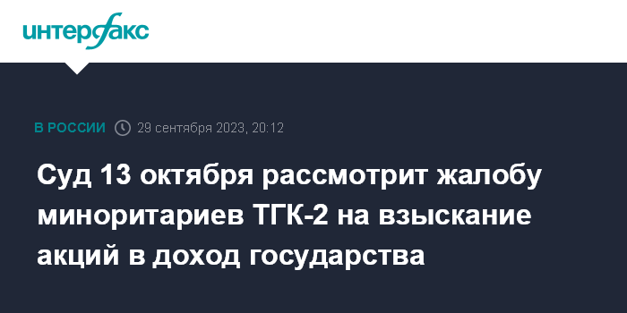 Суд 13 октября рассмотрит жалобу миноритариев ТГК-2 на взыскание акций в доход государства