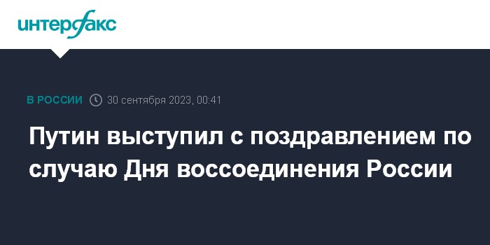 Москва. 30 сентября. INTERFAX.RU - Президент РФ Владимир Путин в видеообращении по случаю Дня воссоединения России отметил помощь, которую оказывают ДНР, ЛНР, Херсонской и Запорожской областям российские регионы.