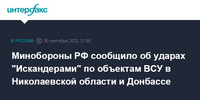 Минобороны РФ сообщило об ударах "Искандерами" по объектам ВСУ в Николаевской области и Донбассе