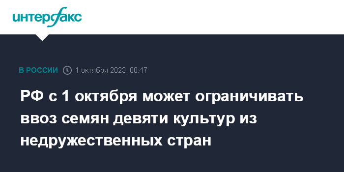 Москва. 1 октября. INTERFAX.RU - РФ с 1 октября по 31 декабря 2023 года может ограничивать ввоз семян девяти сельхозкультур.