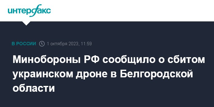 Москва. 1 октября. INTERFAX.RU - Российские военные заявили об уничтожении украинского дрона самолетного типа около 11:00 по Москве в Белгородской области.