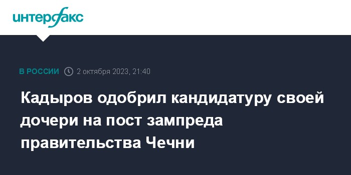 Москва. 2 октября. INTERFAX.RU - Глава Чечни Рамзан Кадыров сообщил в своем телеграм-канале, что одобрил кандидатуру своей дочери Айшат Кадыровой, ранее занимавшей пост министра культуры региона, на должность заместителя председателя правительства Чечни по социальному блоку.