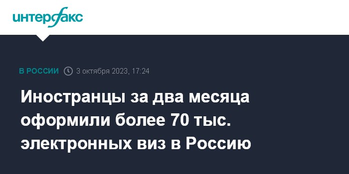 Москва. 3 октября. INTERFAX.RU - Более 70 тыс. электронных виз в Россию выдано иностранным гражданам с 1 августа - даты начала работы соответствующего сервиса, почти 40 тыс. виз оформлены в сентябре, сообщает консульский департамент МИД РФ.