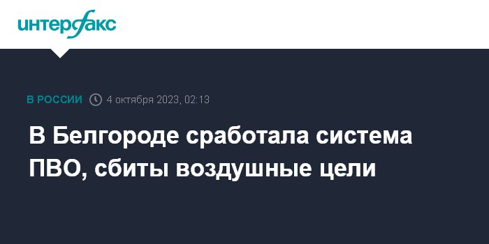 Москва. 4 октября. INTERFAX.RU - Губернатор Белгородской области Вячеслав Гладков сообщил, что над Белгородом и Белгородским районом сработала система ПВО.
