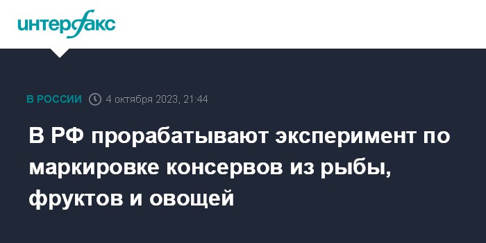 Москва. 4 октября. INTERFAX.RU - Минпромторг прорабатывает запуск в РФ эксперимента по маркировке готовых или консервированных продуктов из мяса, мясных субпродуктов, овощей и фруктов, грибов и ягод, рыбы с 1 декабря 2023 года.