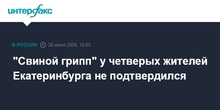 Москва. 28 июля. INTERFAX.RU - У четверых госпитализированных в Екатеринбурге с подозрением на грипп A/H1N1 и выписанных во вторник, диагноз "свиной грипп", по неофициальным данным, не подтвердился, сообщила агентству "Интерфакс" во вторник пресс-секретарь Российского союза туриндустрии Ирина Тюрина.
