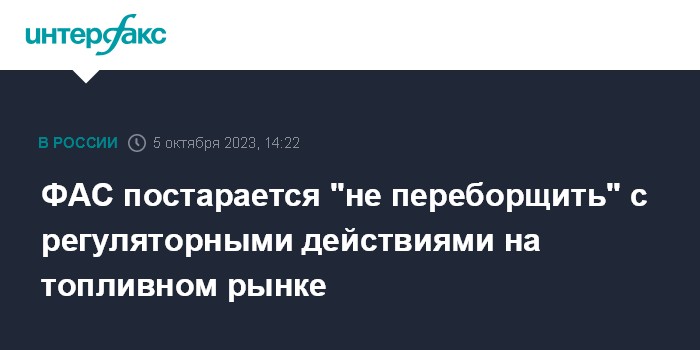 Москва. 5 октября. INTERFAX.RU - Федеральной антимонопольной службе важно не переборщить с регуляторными действиями на топливном рынке, заявил журналистам глава ведомства Максим Шаскольский.
