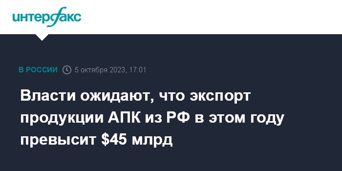 Москва. 5 октября. INTERFAX.RU - Экспорт продукции АПК из РФ в этом году превысит $45 млрд, сообщил министр сельского хозяйства Дмитрий Патрушев на пленарном заседании в рамках агровыставки "Золотая осень-2023" в четверг в Москве.
