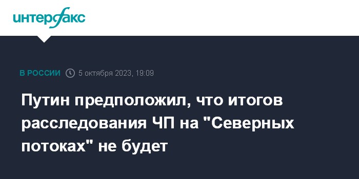 Москва. 5 октября. INTERFAX.RU - Президент РФ Владимир Путин заявил, что расследование взрывов на "Северных потоках" безрезультатно, и, скорее всего, этих результатов не будет.