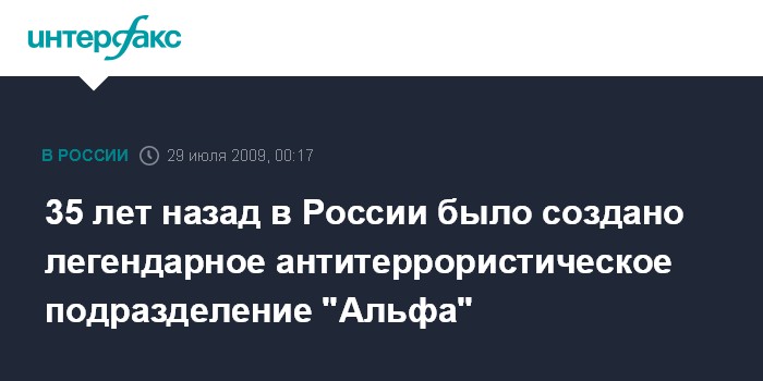 Москва. 29 июля. ИНТЕРФАКС - Знаменательная дата в истории отечественных спецслужб отмечается в эту среду - приказом председателя КГБ СССР Юрия Андропова 29 июля 1974 года было создано первое в истории страны специальное антитеррористическое подразделение - группа "Альфа". Сейчас это Управление "А" Центра специального назначения (ЦСН) ФСБ России.