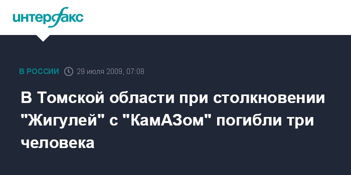 Томск. 29 июля. ИНТЕРФАКС-СИБИРЬ - В Томской области на 87 километре дороги Первомайское - Улу-Юл автомобиль "ВАЗ-2106" столкнулся с автомобилем "КамАЗ", три человека погибли.