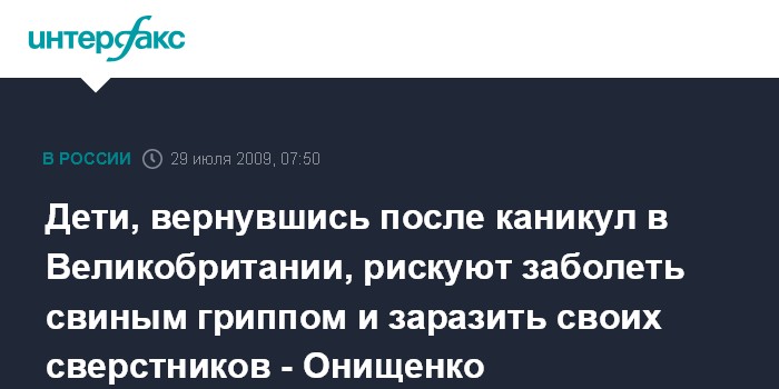 "Сентябрь станет знаковым месяцем в плане гриппа, учитывая, что в России дети вернутся в школы в организованные коллективы. Чем меньше они будут в Великобританию ездить, тем лучше - меньше риск заразиться", - сказал Г.Онищенко.