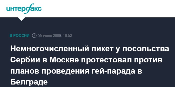Москва. 29 июля. INTERFAX.RU - Митинг протеста против проведения в августе в Белграде гей-парада прошел накануне в Москве у посольства Сербии, сообщил в среду "Интерфаксу" источник в правоохранительных органах.