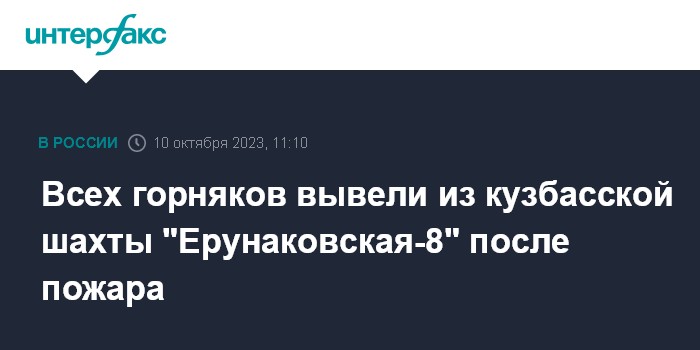 Москва. 10 октября. INTERFAX.RU - Все сотрудники шахты "Ерунаковской-8" (входит в ПАО "Распадская"), на поверхности которой произошел пожар, поднялись на поверхность.