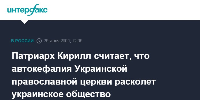 Москва. 29 июля. INTERFAX.RU - Патриарх Московский и Всея Руси Кирилл считает несвоевременной автокефалию Украинской православной церкви. Как сказал патриарх в среду в Киево-Печерской лавре, что надо объединяться вокруг общей идеи, а автокефалия сегодня такой общей идеей не является.