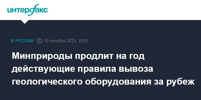 Москва. 10 октября. INTERFAX.RU - Минприроды предлагает продлить до 31 декабря 2025 года действие ведомственного приказа, регулирующего порядок выдачи разрешений на вывоз из страны отдельных видов лабораторного, добычного, геологоразведочного и геофизического оборудования.