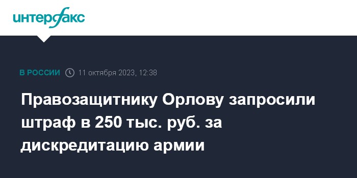 Москва. 11 октября. INTERFAX.RU - Гособвинение попросило назначить штраф в 250 тысяч рублей правозащитнику, бывшему члену правления ликвидированного общества "Международный "Мемориал" (признано в России иноагентом) Олегу Орлову, обвиняемому в повторной дискредитации Вооруженных сил России, сообщили в Головинском суде Москвы.