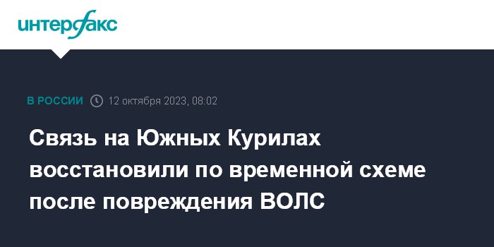 Москва. 12 октября. INTERFAX.RU - Связь с населенными пунктами Южных Курил восстановили по временной схеме после повреждения подводного участка волоконно-оптической линии связи (ВОЛС) между островами Итуруп и Кунашир, сообщила пресс-служба правительства Сахалинской области.