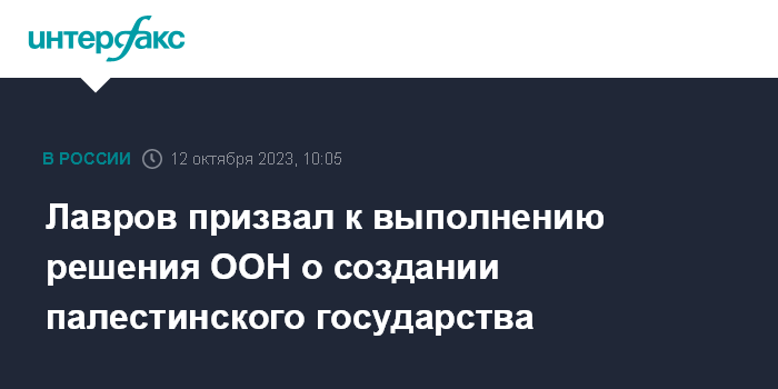Москва. 12 октября. INTERFAX.RU - Глава МИД РФ Сергей Лавров рассчитывает, что после завершения вооруженного противостояния израильтян и палестинцев все стороны всерьез отнесутся к реализации решений СБ ООН по созданию палестинского государства.