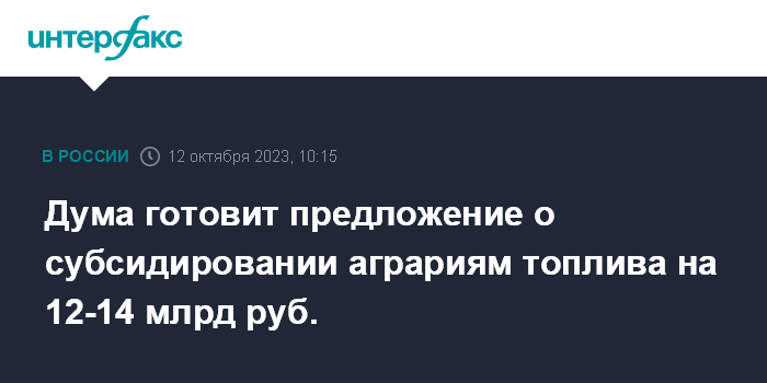 Москва. 12 октября. INTERFAX.RU - Госдума готовит предложение о субсидировании предприятиям сельскохозяйственного сектора покупки нефтепродуктов на 12-14 млрд рублей. Об этом сообщил журналистам председатель комитета Госдумы по энергетике Павел Завальный в кулуарах Российской энергетической недели.