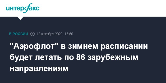 Москва. 12 октября. INTERFAX.RU - "Аэрофлот" в осенне-зимнем расписании, вступающем в силу с 29 октября, будет летать по 190 направлениям, в том числе по 86 зарубежным, сообщила авиакомпания.