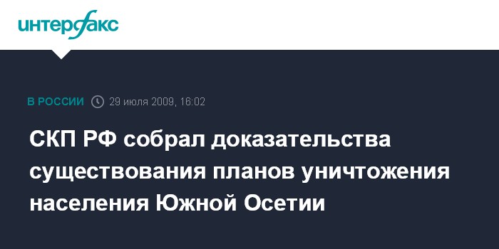 Москва. 29 июля. INTERFAX.RU - СКП РФ собрал документы, доказывающие планы грузинских властей по уничтожению осетинского населения Южной Осетии в ходе прошлогодней августовской войны. Как заявил "Интерфаксу" в среду официальный представитель СКП РФ Владимир Маркин, в зоне конфликта изъята документация вооруженных сил Грузии, топографические карты, планы и приказы, свидетельствующие о планах Грузии уничтожить осетинское население. По его словам, эти данные были приведены в ходе встречи представителей СКП РФ с руководством миссии Евросоюза по расследованию причин конфликта на Южном Кавказе в августе 2008 года.