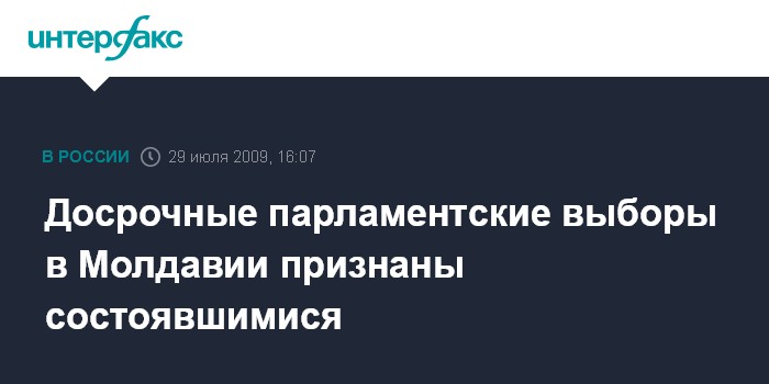 Москва. 29 июля. INTERFAX.RU - Досрочные выборы в парламент Молдавии, которые проходят в среду, признаны состоявшимися, сообщил "Интерфаксу" секретарь Центральной избирательной комиссии Юрий Чокан. По его словам, по состоянию на 15:00 местного времени (16:00 МСК) в выборах приняло участие более 35% избирателей, имеющих право голоса.