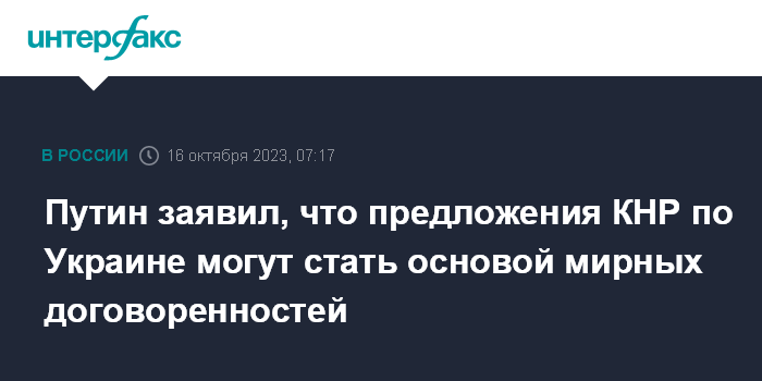 Москва. 16 октября. INTERFAX.RU - Предложения Китая по украинскому урегулированию могут быть положены в основу мирных договоренностей, заявил президент РФ Владимир Путин.