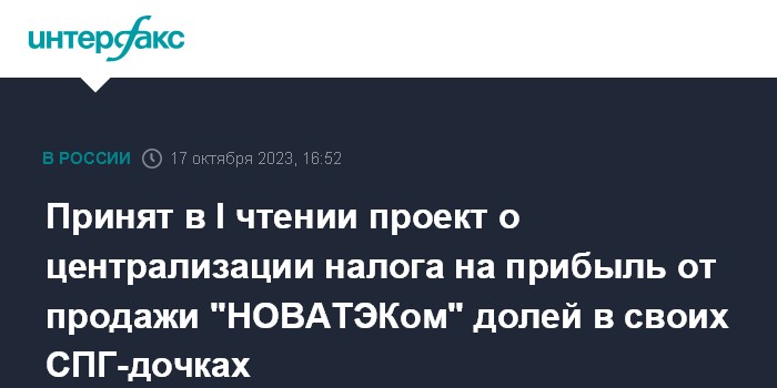 Москва. 17 октября. INTERFAX.RU - Госдума приняла в первом чтении законопроект о перечислении в полном объеме в федеральный бюджет налога на прибыль от операций по продаже "НОВАТЭКом" долей в своих дочерних компаниях, владеющих правом на экспорт сжиженного природного газа (СПГ).
