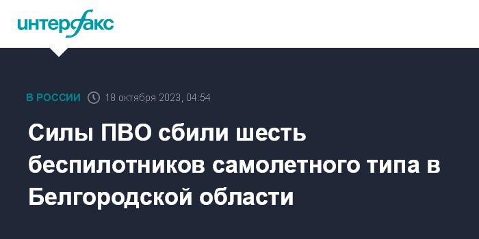 Москва. 18 октября. INTERFAX.RU - Губернатор Белгородской области Вячеслав Гладков в ночь на среду сообщил о шести сбитых украинских дронах.