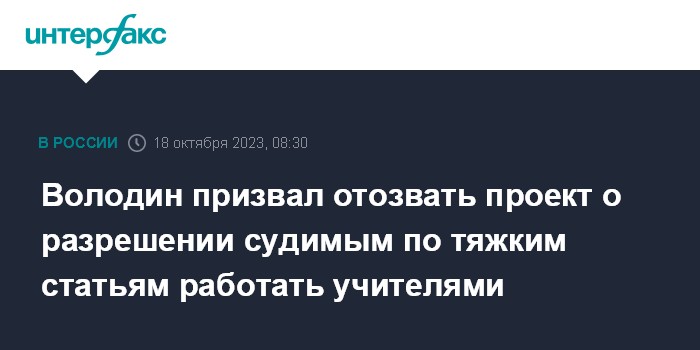Москва. 18 октября. INTERFAX.RU - Председатель Госдумы Вячеслав Володин призвал авторов отозвать законопроект о разрешении отбывшим срок заключения за умышленные тяжкие и особо тяжкие преступления работать учителями, воспитателями и тренерами.