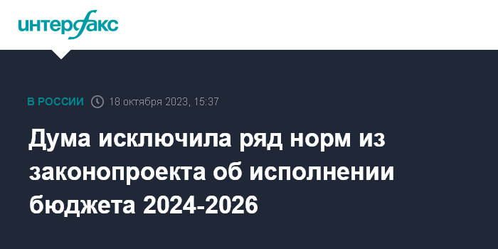Москва. 18 октября. INTERFAX.RU - Госдума исключила из законопроекта об особенностях исполнения федерального бюджета на 2024-2026 год ряд норм, ранее предложенных правительством.