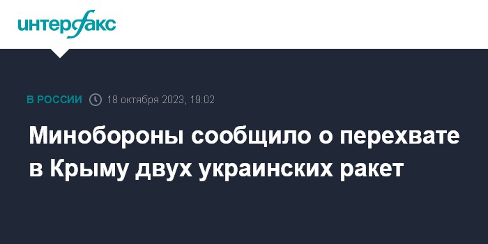 Москва. 18 октября. INTERFAX.RU - Минобороны России заявило, что 18 октября около 17:40 по Москве были перехвачены две украинские ракеты комплекса С-200, которыми ВСУ хотели атаковать объекты в Крыму.