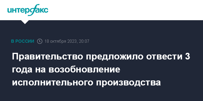 Москва. 18 октября. INTERFAX.RU - Возобновить исполнительное производство можно будет в течение трех лет с момента устранения причин или обстоятельств, послуживших основаниями для его приостановления, говорится в законопроекте № 462778-8, который правительство внесло в Госдуму.