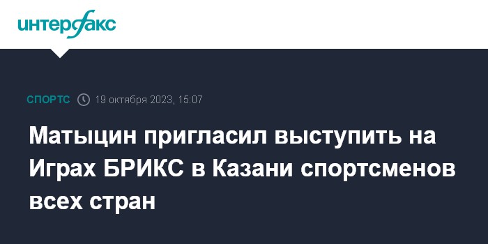 Москва. 19 октября. INTERFAX.RU - Министр спорта Олег Матыцин заявил, что предстоящие в Казани Игры БРИКС будут открыты для спортсменов из всех стран, которые захотят принять участие в соревнованиях.