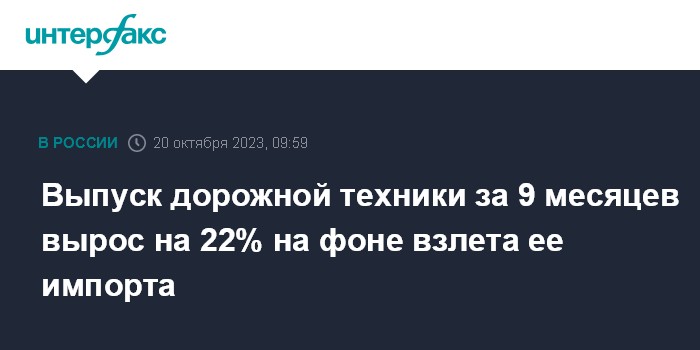 Москва. 20 октября. INTERFAX.RU - Производство и продажи на российском рынке отечественной дорожно-строительной техники за 9 месяцев выросли на 22% при взлете импорта такой техники за чуть меньший период на 66%, сообщили в Российской ассоциации производителей специализированной техники и оборудования (Росспецмаш).