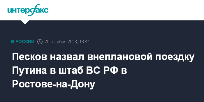 Москва. 20 октября. INTERFAX.RU - Поездка президента Владимира Путина в штаб Вооруженных сил РФ в Ростове-на-Дону не была запланирована и была согласована "достаточно оперативно", заявил пресс-секретарь главы государства Дмитрий Песков.