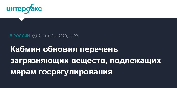 Москва. 21 октября. INTERFAX.RU - Правительство России актуализировало перечень загрязняющих веществ, в отношении которых применяются меры госрегулирования, сообщается на сайте правительства.