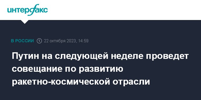 Москва. 22 октября. INTERFAX.RU - Президент РФ Владимир Путин проведет совещание по вопросам развития ракетно-космической отрасли.