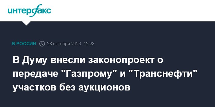 Москва. 23 октября. INTERFAX.RU - В Госдуму внесены поправки к федеральному закону "О недрах", предполагающие предоставление лицензий на участки общераспространенных полезных ископаемых (ОПИ) "Газпрому" и "Транснефти" без аукционов.