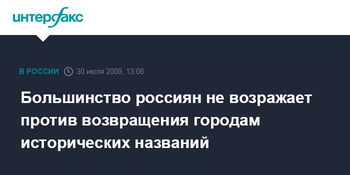 Москва. 30 июля. INTERFAX.RU - Россияне спокойно относятся к переименованию городов, улиц, вокзалов и других объектов, аргументируя свою позицию главным образом необходимостью возвращения им исконных названий, противники указывают в первую очередь на большие затраты этого процесса, выяснили социологи.