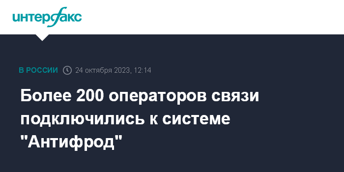 Москва. 24 октября. INTERFAX.RU - Систему Роскомнадзора (РКН) по блокировке звонков с подменных номеров "Антифрод" используют уже более 200 операторов связи, сообщил руководитель РКН Андрей Липов.