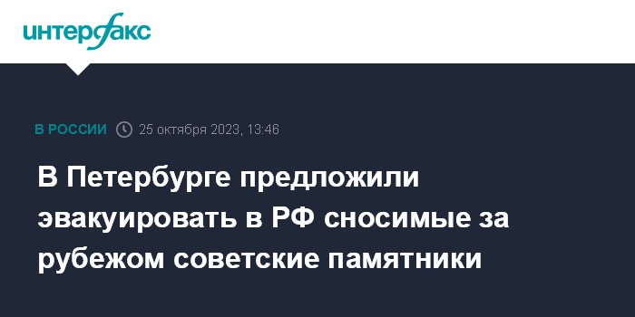 Москва. 25 октября. INTERFAX.RU - Петербургский парламент предложил обязать РФ эвакуировать советские памятники из-за рубежа в случае угрозы их демонтажа или уничтожения.